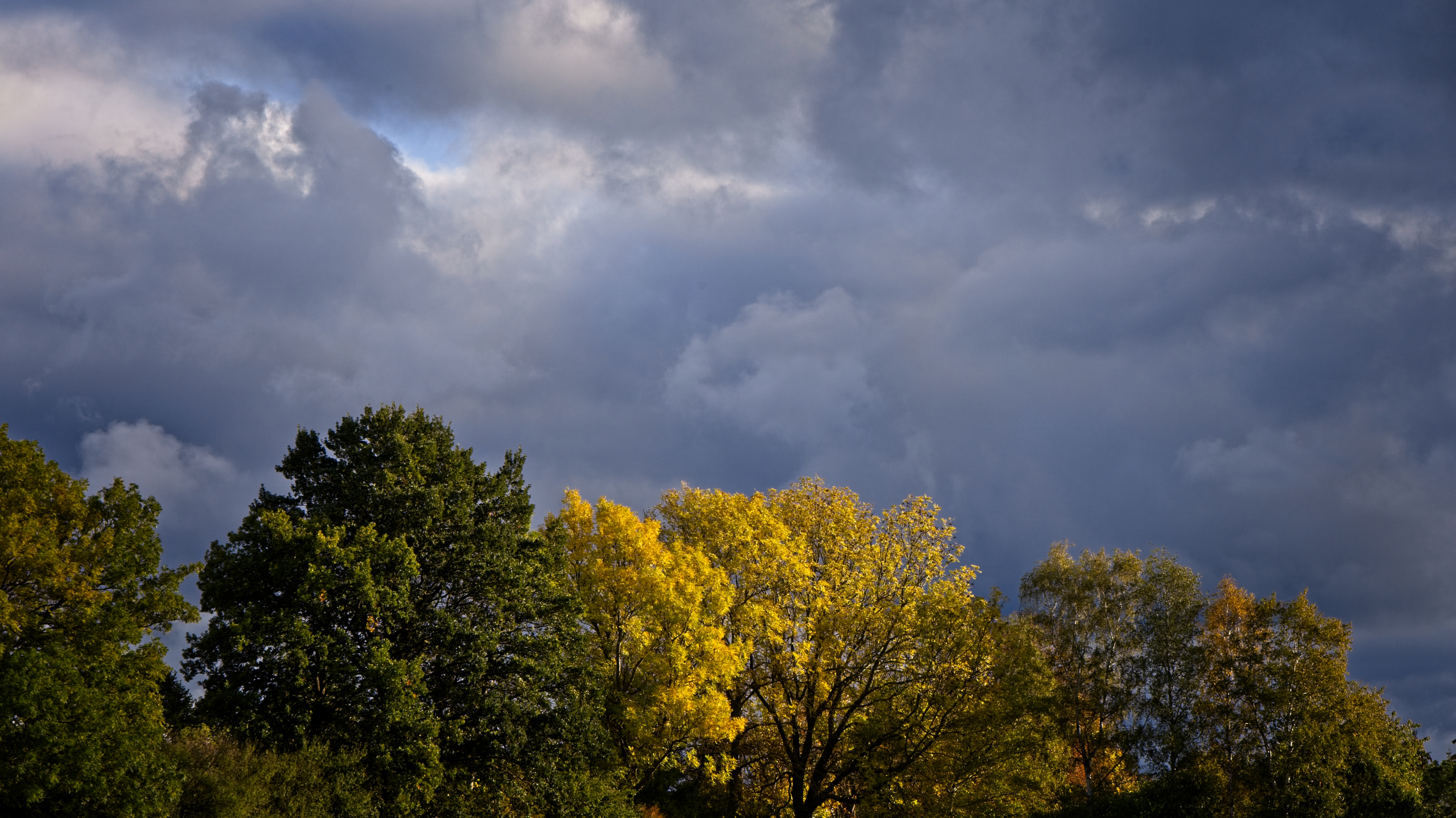 If the sun's light is directed to autumn trees which are in front of a "threatening" bank of clouds it is almost an atmospheric photo.